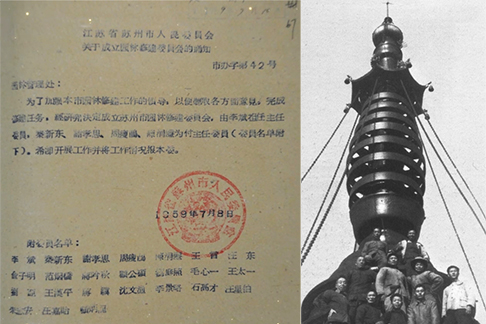 (左)1959年7月8日 江苏省苏州市人民委员会关于成立园林修建委员会的通知(右)1965年 园林修建队修复北寺塔